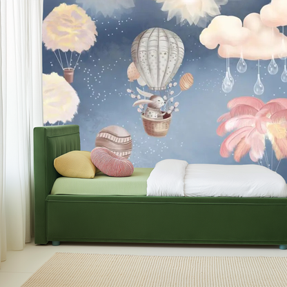 Transform any playroom, nursery, or child’s bedroom into a dreamy sky escape with our Balloon Dreams Mural Wallpaper. Featuring softly illustrated hot air balloons, fluffy pastel clouds, rain drops, and a gentle rabbit flying high, this mural creates a peaceful and imaginative atmosphere for little ones.