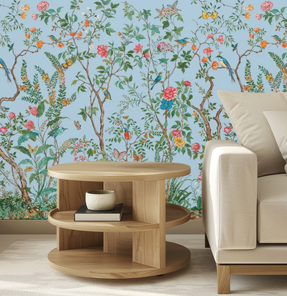 This stunning print features a delicate mix of blue tones and intricate floral and wildlife design, perfect for creating a calming and serene atmosphere in any space.