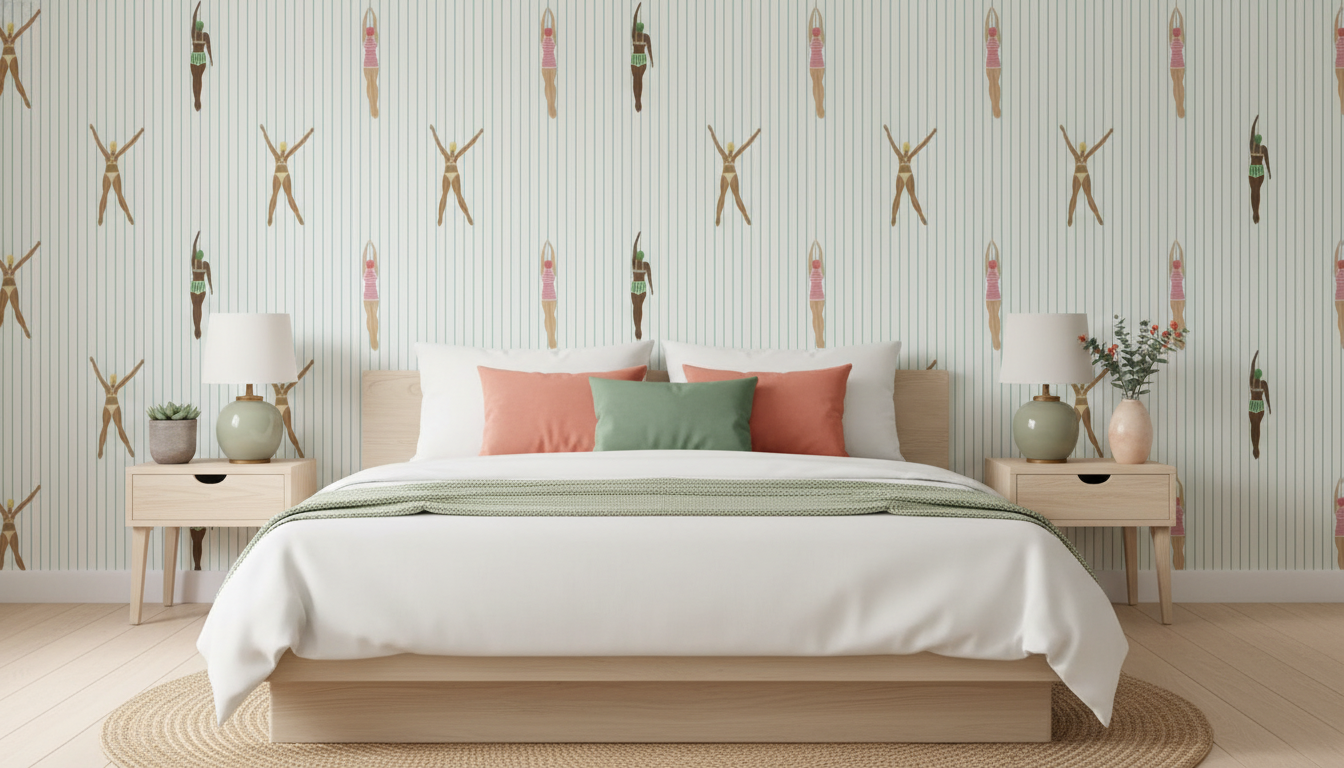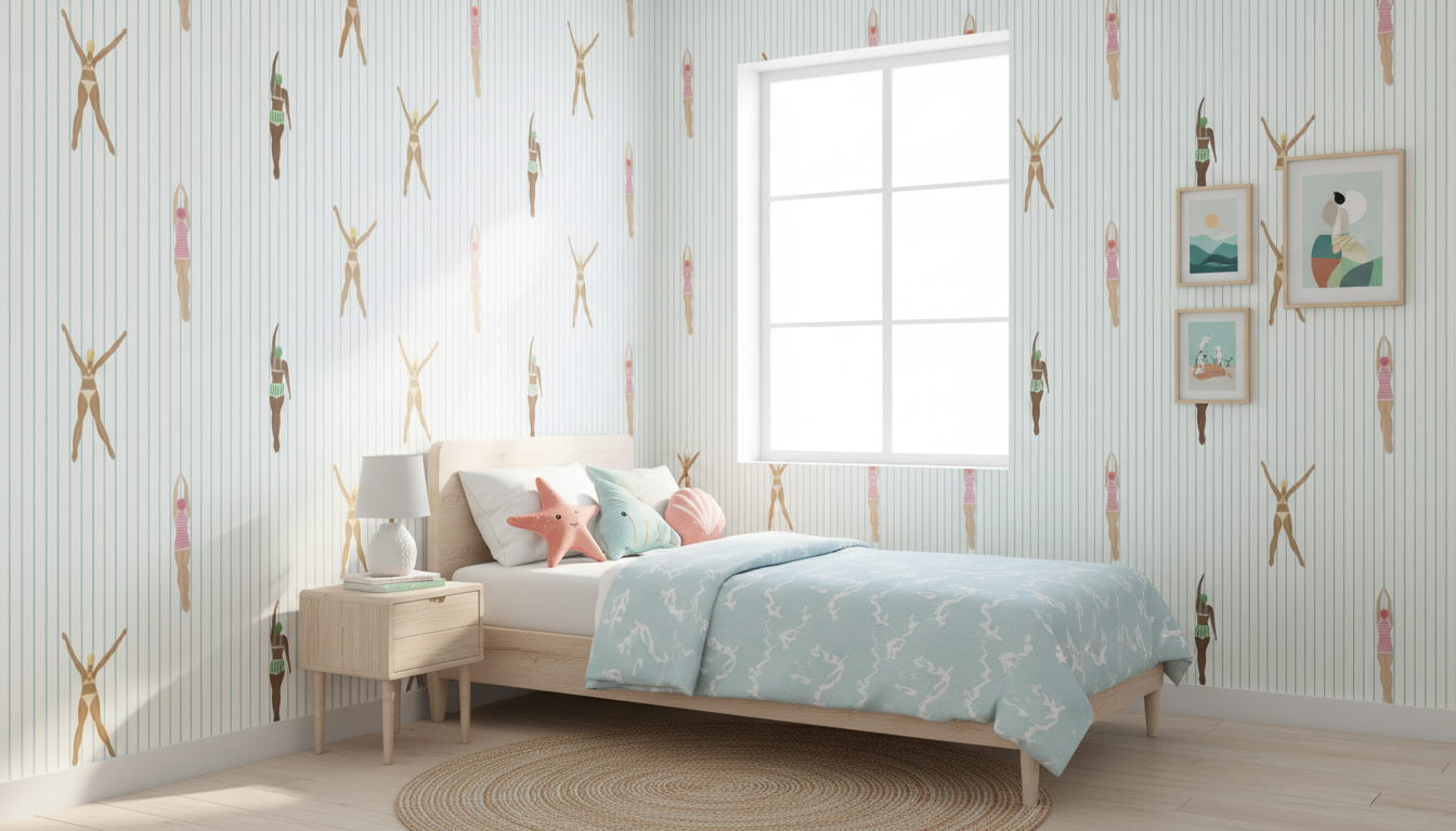 Dive into nostalgia with this fun blue striped retro swimmers wallpaper! Inspired by vintage seaside charm, cheerful swimmers and bold stripes create a playful, energetic vibe perfect for children's rooms, bathrooms, or beach themed spaces. The retro aesthetic brings a dash of quirky personality and timeless appeal to any wall. This wallpaper captures the carefree spirit of summer fun.