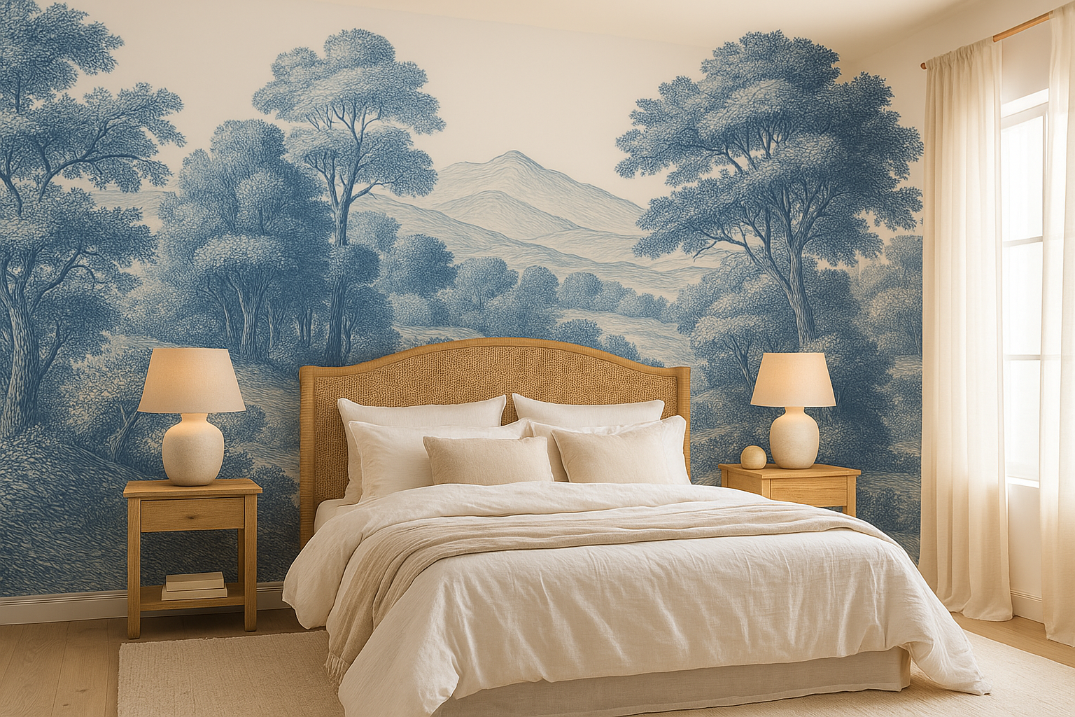 Transform your bedroom into a serene retreat with the Blue Toile Scenic Mural Wallpaper. Featuring a vintage-inspired tree and mountain design, this elegant mural adds timeless charm and depth to your walls. Its soothing blue tones create a calming atmosphere, perfect for restful nights and stylish living. Elevate your space effortlessly with this classic yet captivating wallpaper.
