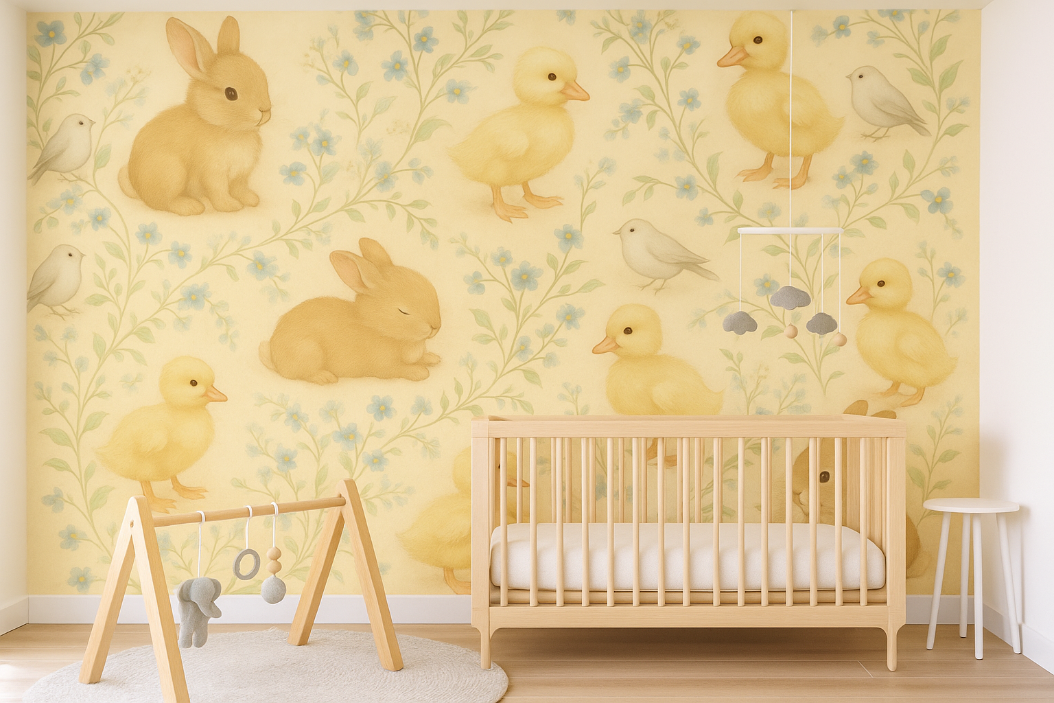 Transform your baby’s room with our Bunny & Duckling Nursery Mural Wallpaper – a gentle and elegant design featuring hand-drawn bunnies, ducklings, birds, and trailing florals in soft pastel yellows. This calming wallpaper makes the perfect nursery feature wall and is designed to bring a whimsical, timeless charm to your baby’s space.