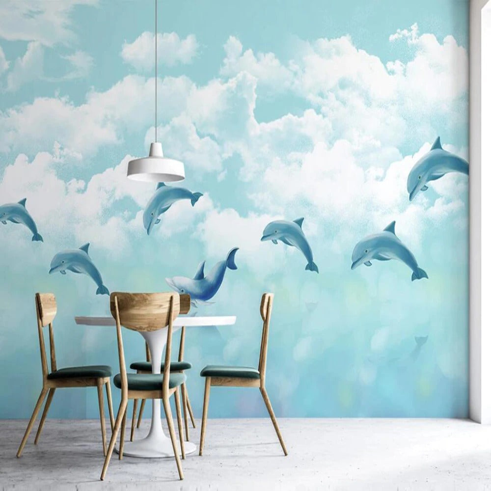 The Blue Dolphins In The Clouds Mural Wallpaper will help you make your room a fun and whimsical place. The sky is blue and the dolphins are happy. It's a relaxing view that is sure to make you smile. The dolphins are relaxing in the clouds and looking down on you. This wallpaper is perfect for those who want to make their room a happy place.