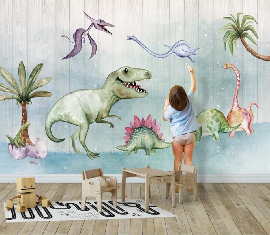 Add a touch of adventure and dinosaur fun to your child's room with this charming wall mural. With a palm tree, colourful flying dinosaurs and a friendly T-Rex, it is sure to make kids smile.