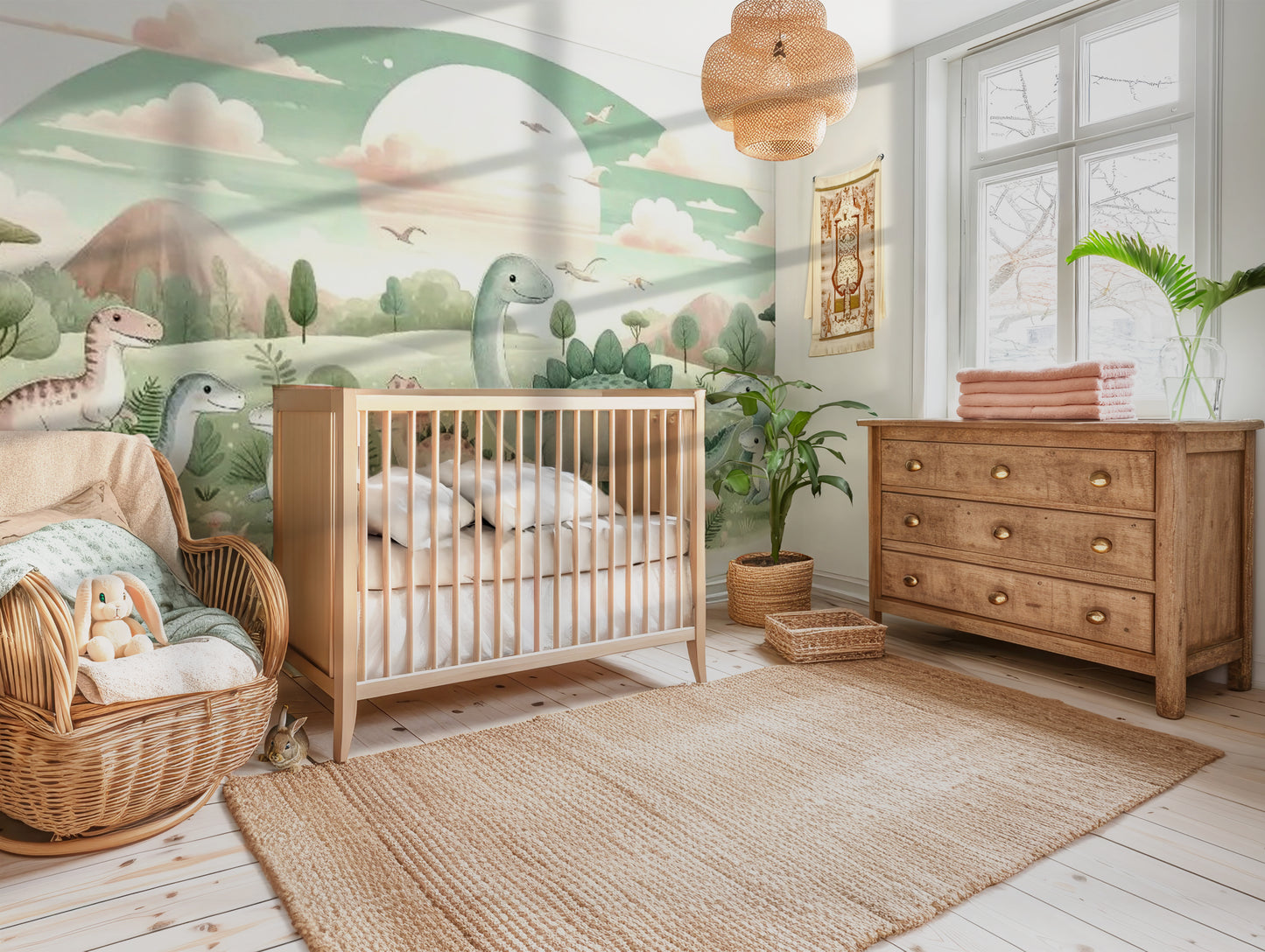Welcome gentle dinos into your little one’s world with the Friendly Valley Dinosaur Mural. Featuring smiling dinosaurs, fluffy trees, and a glowing sunrise in soothing greens and blush pinks, this mural is perfect for creating a joyful, nurturing atmosphere in any nursery or playroom. A beautifully illustrated scene that feels both magical and calming.