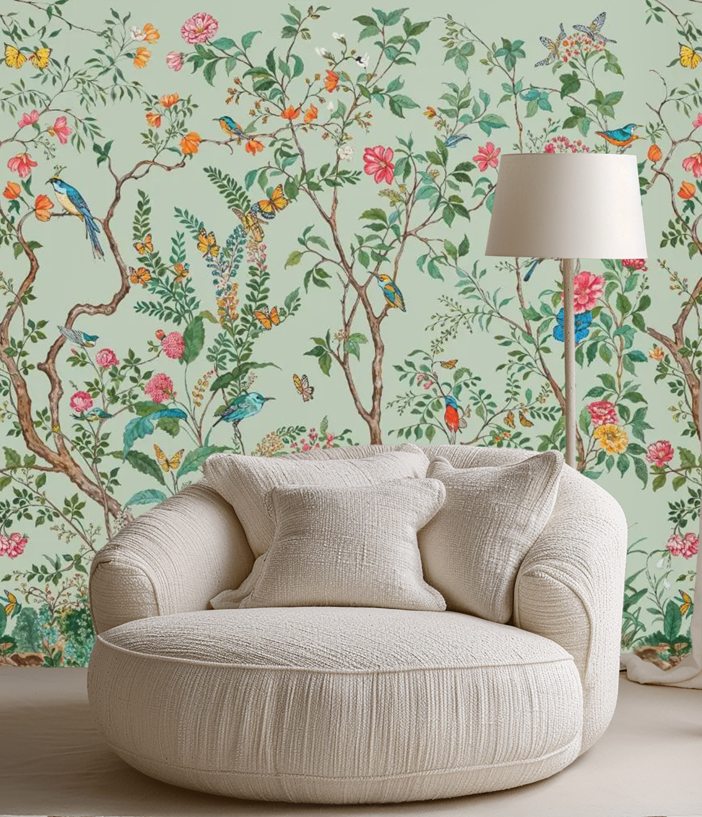 This stunning print features a delicate mix of green tones and intricate floral and wildlife design, perfect for creating a calming and serene atmosphere in any space.